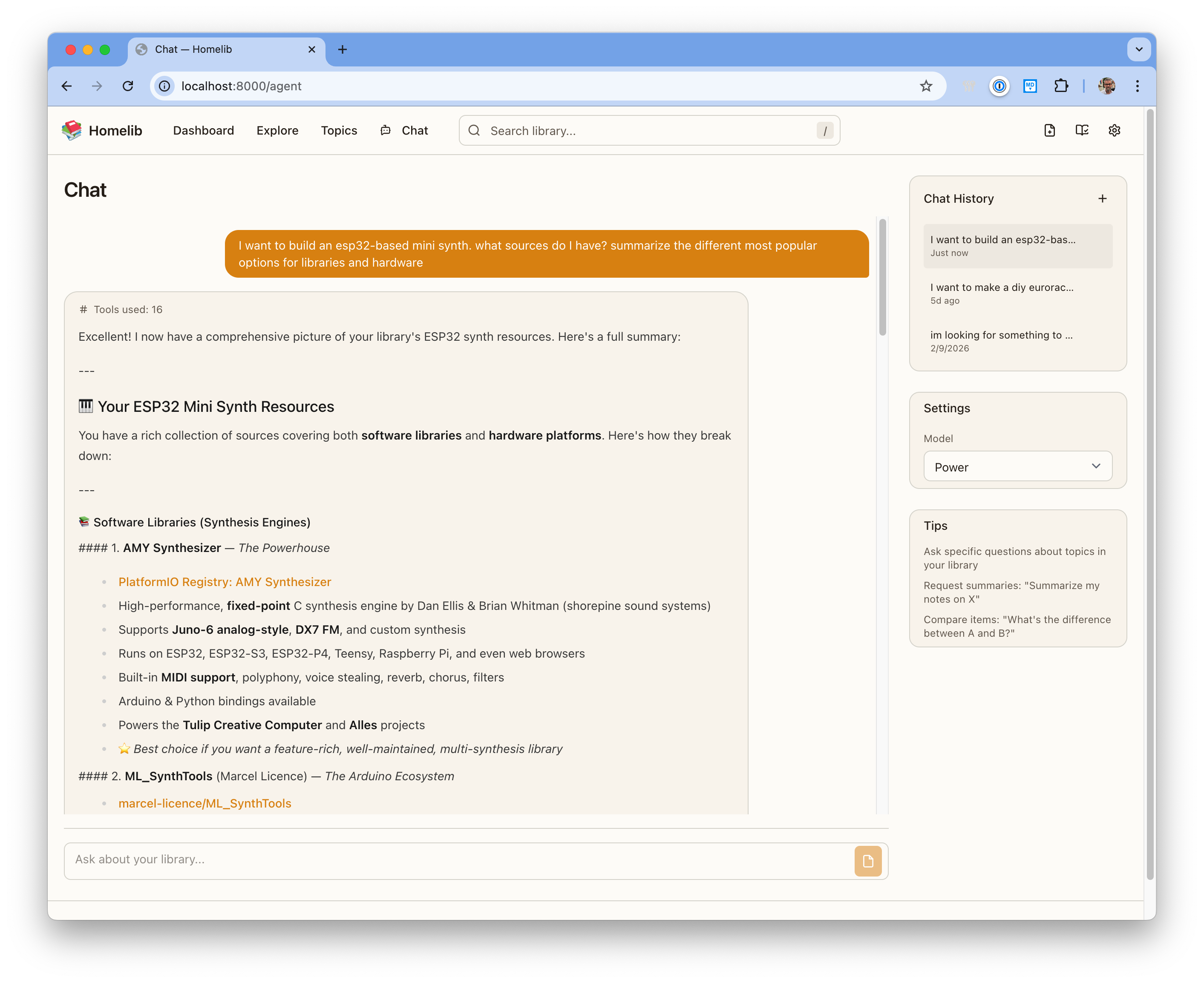 Ask questions and get answers grounded in your own collection. The agent searches, compares items, and summarizes topics.