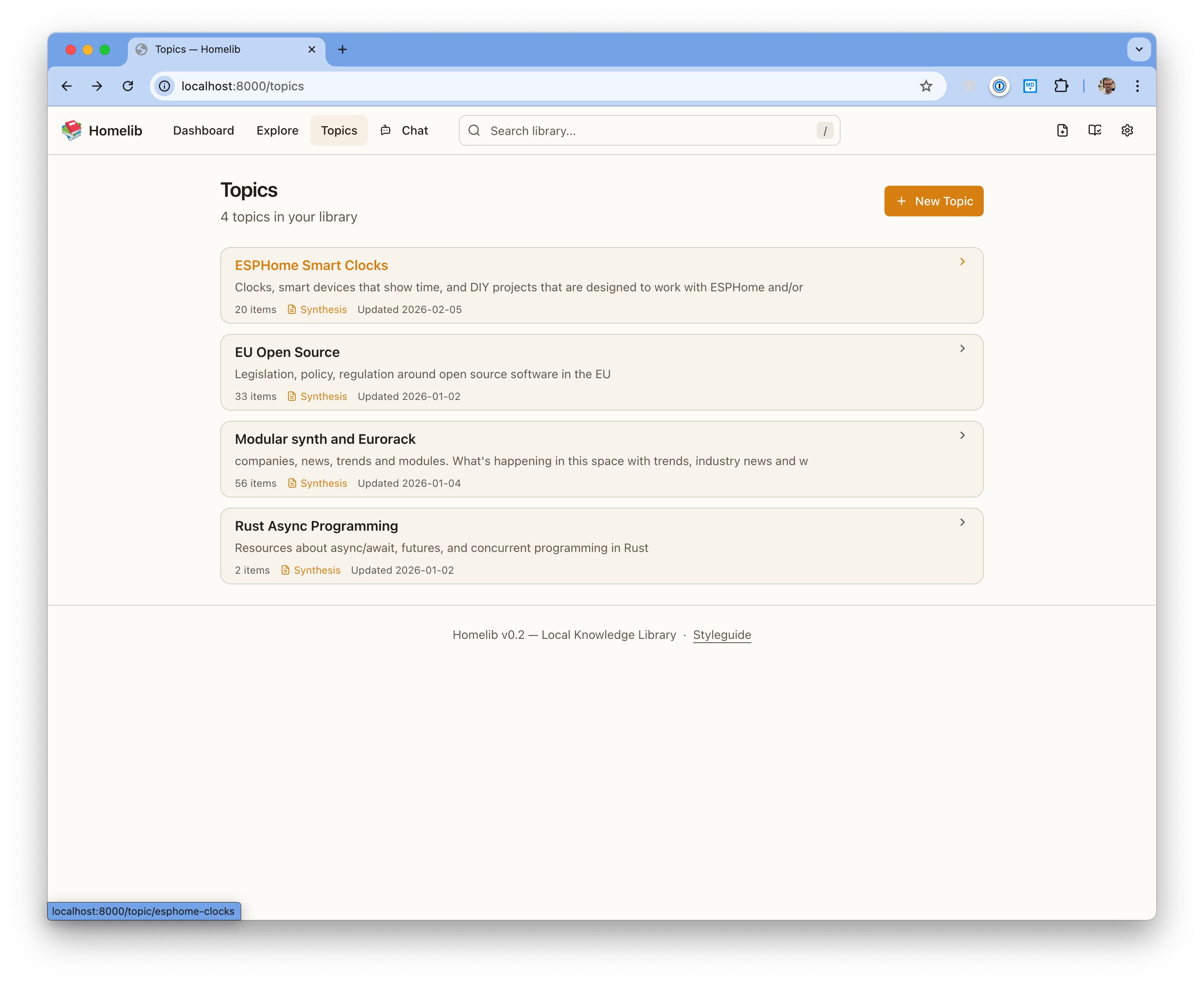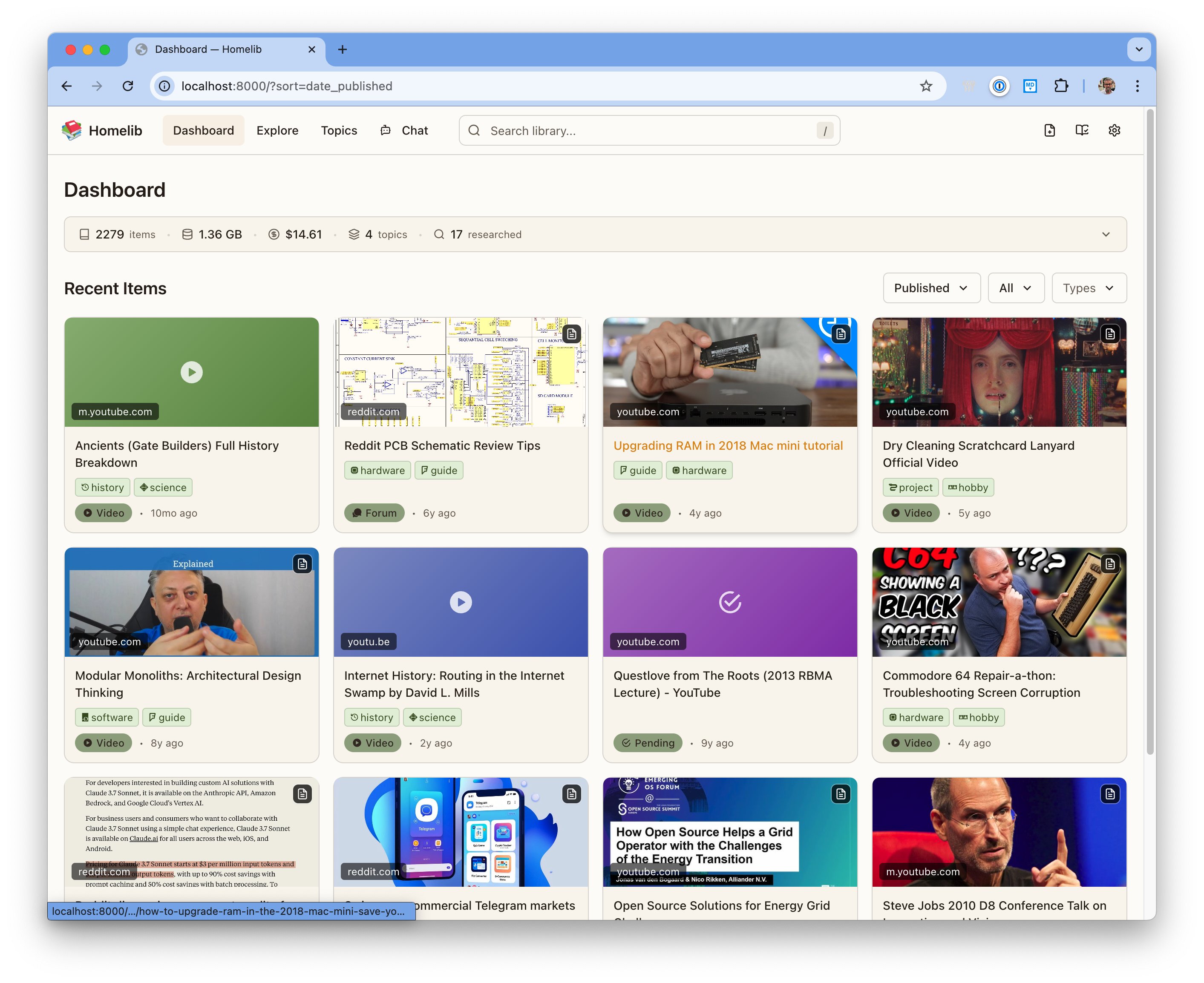 Your bookmarks, starred repos, and saved articles live on someone else's servers. The content behind them disappears behind paywalls, gets edited, or vanishes. Homelib gives you a private knowledge library on your own machine. Save a URL and it reads the content for you — fetches it, summarizes it, extracts entities, and makes everything searchable.