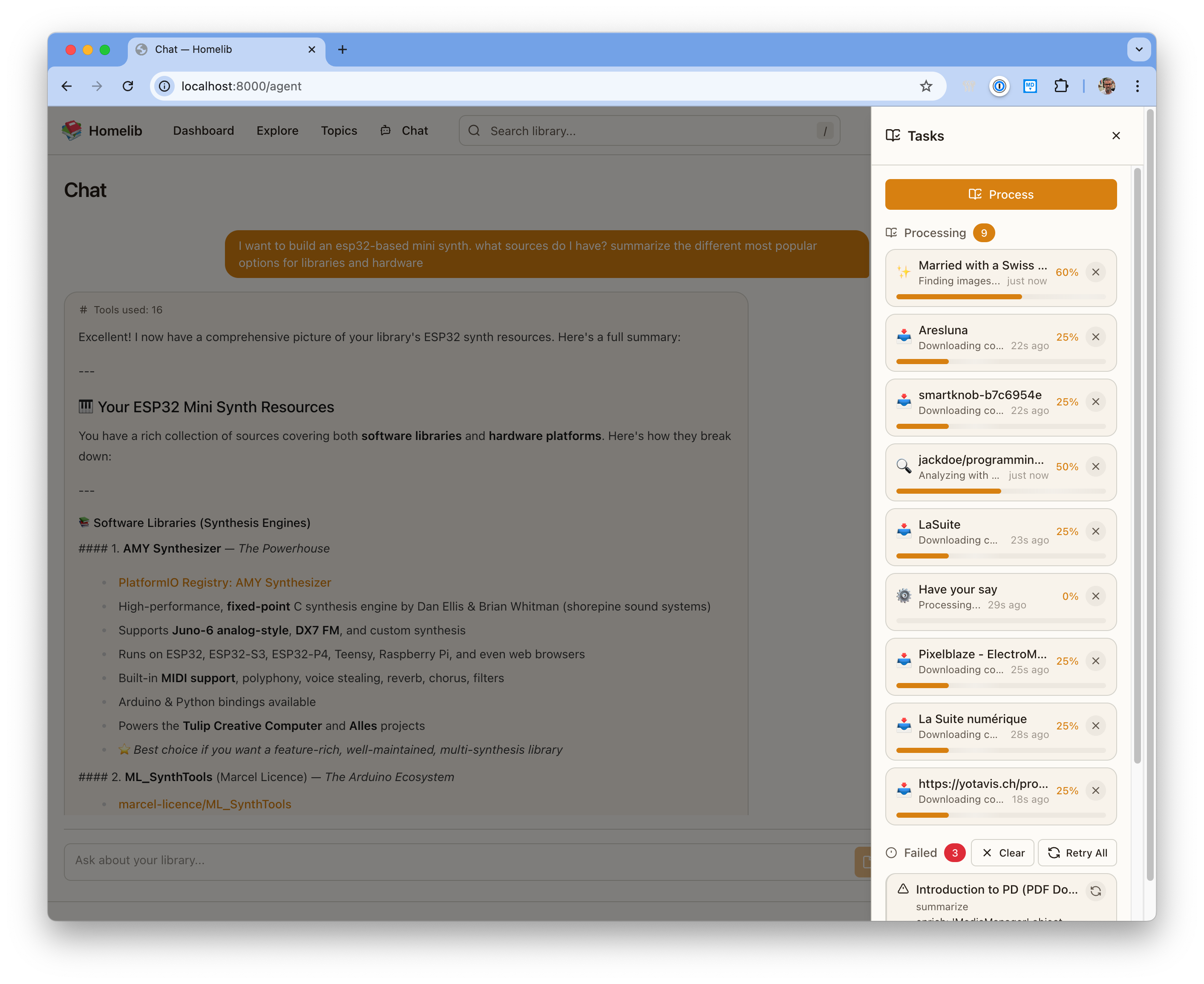 Start with a bookmark of a DIY project. Homelib discovers the products used, the tools, the people behind it. It researches these through web searches and builds knowledge on top of that item.