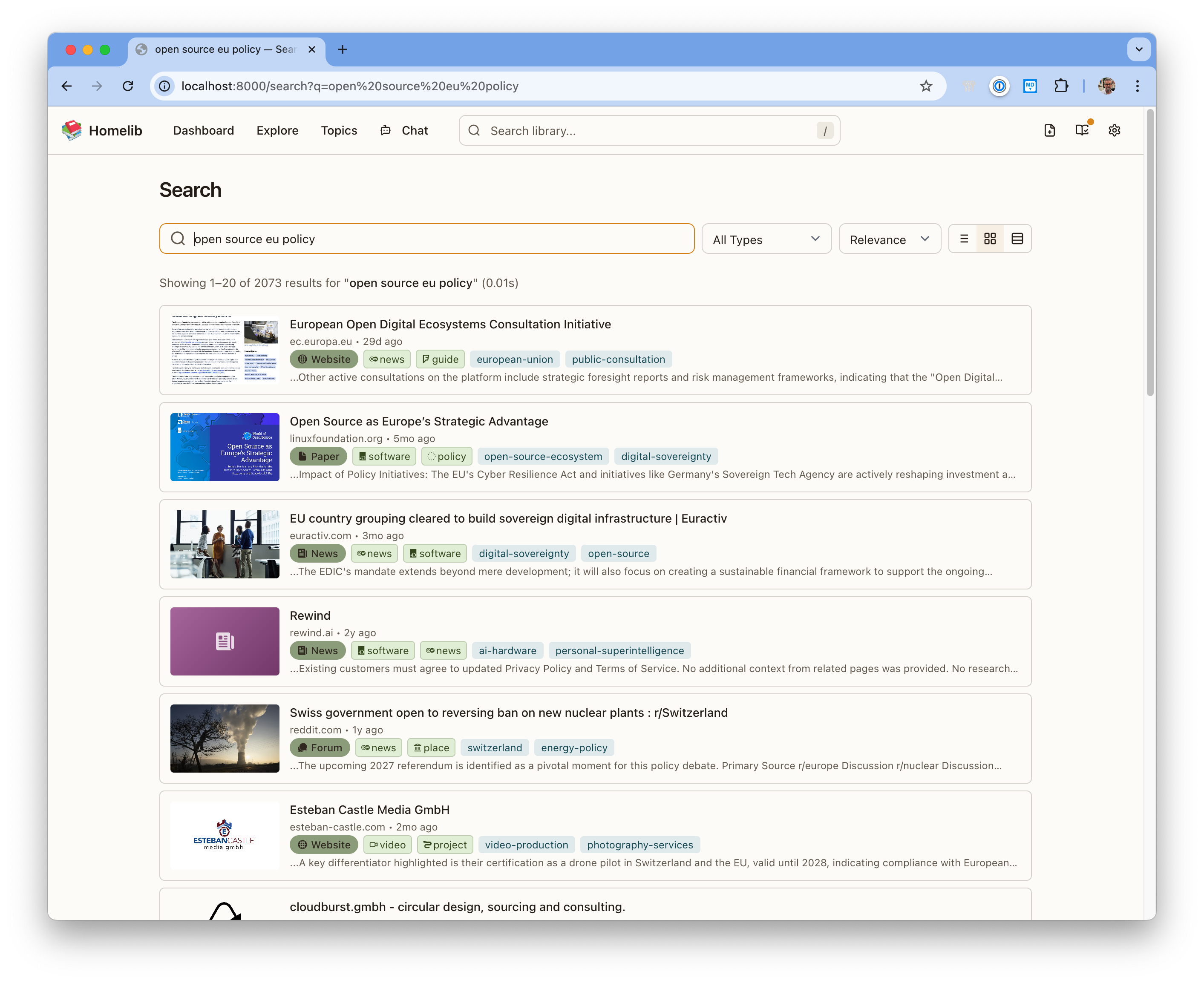 Save a URL and Homelib reads it for you. It fetches the content, converts it to clean Markdown, and analyzes it with AI — classifying, tagging, extracting people, companies, products, and places. Everything gets indexed and searchable.
